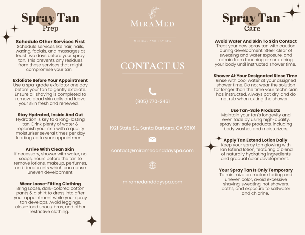 When you come in for a spray tan at MiraMed and Day Spa, our friendly staff will guide you through the entire process to ensure you have a comfortable experience. Here’s what to expect: