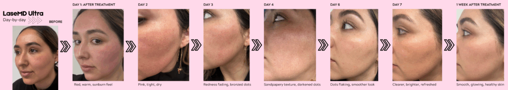 Ultra Laser resurfacing recovery timeline showing day-by-day healing from redness and sandpaper texture to smooth glowing skin.